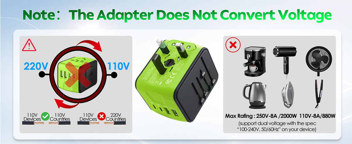 This travel adapter is NOT a Voltage Converter. It is compatible with 100-250V, (50/60Hz) AC-powered devices. |